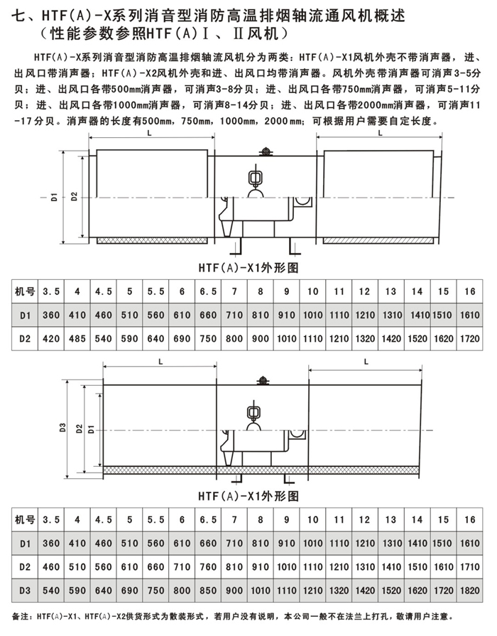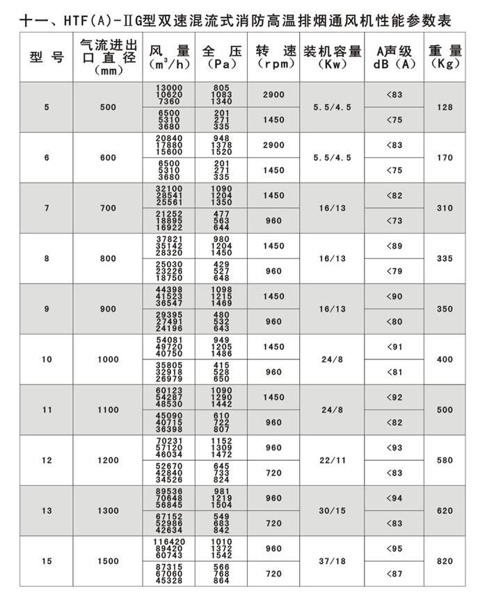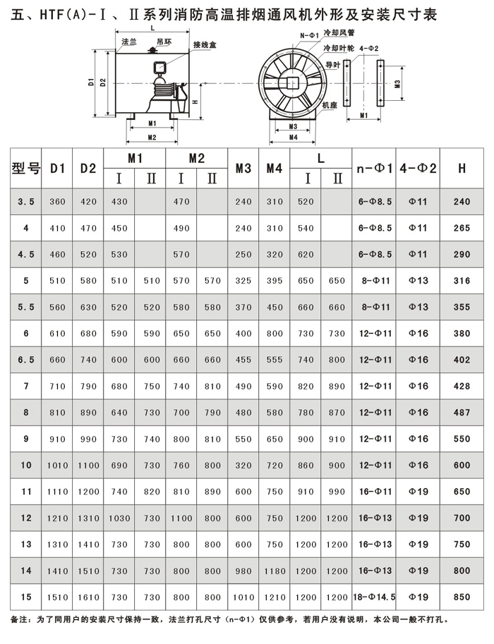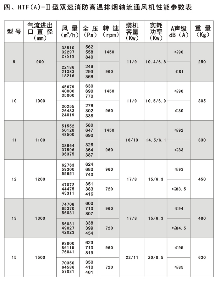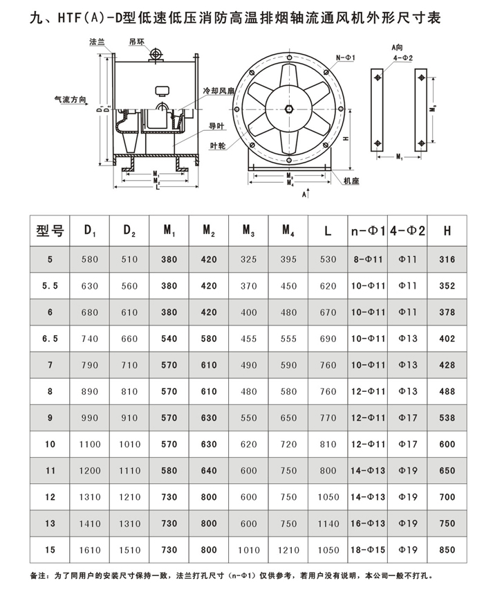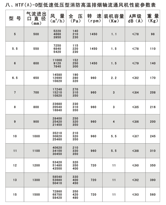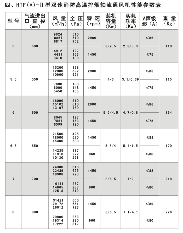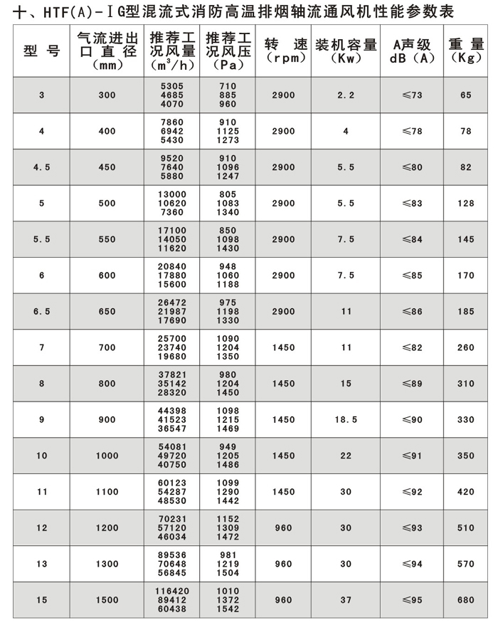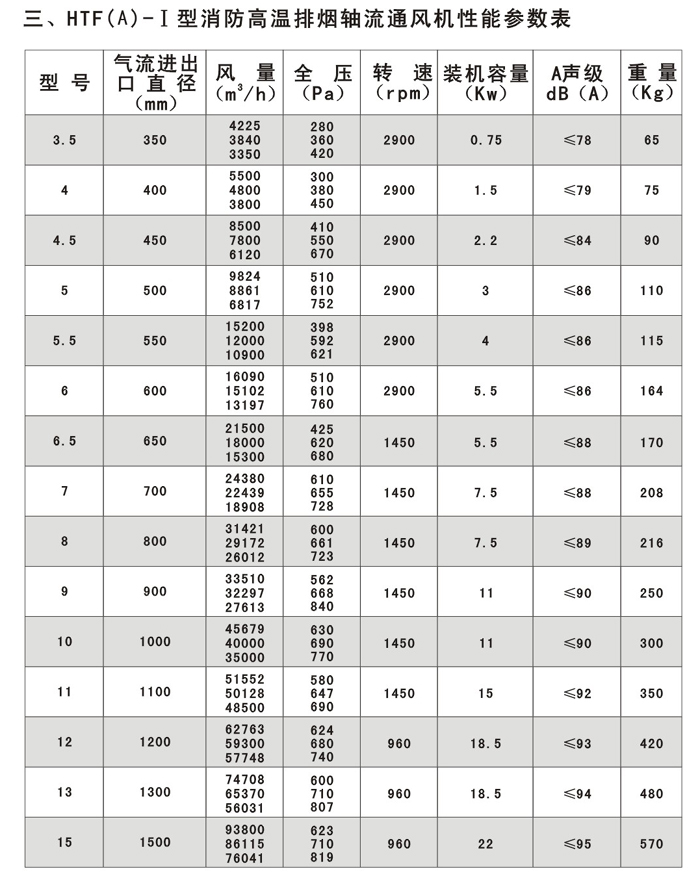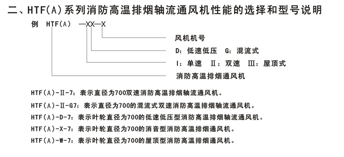 1. HTF(A)系列消防高溫排煙軸流通風機,其基本形式為軸流式結構,采用耐高溫電機,配有專門的電機冷卻系統(tǒng)。具有性能優(yōu)良、耐高溫性能良好、效率高、占地比離心風機少、安裝方便等特點。