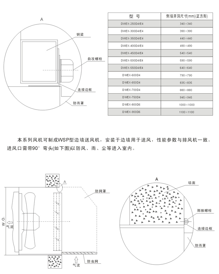DWEX(WEX)邊墻風(fēng)機(jī)一般用于邊墻壁式排風(fēng),配設(shè)45°防雨罩(或特殊制造成60°)和防蟲網(wǎng)(夜間可防止昆蟲循燈光飛入車間)?砂葱枰瞥蛇厜λ惋L(fēng)機(jī)型號為DWSP(WSP),配設(shè)90°防雨罩(防風(fēng)、雨、塵)和防蟲網(wǎng)(夜間可防止昆蟲循燈光飛入車間)。