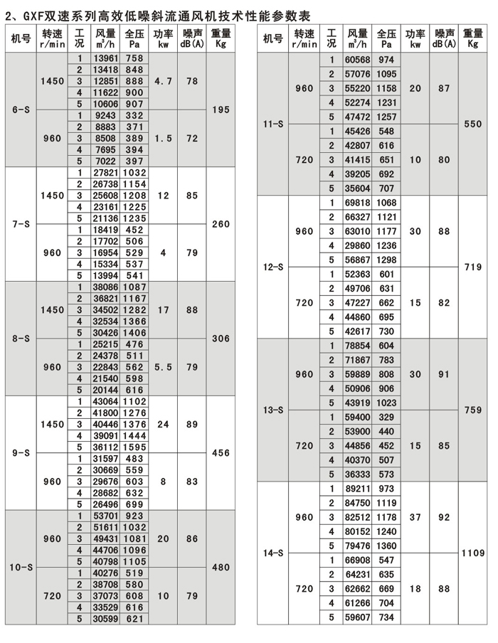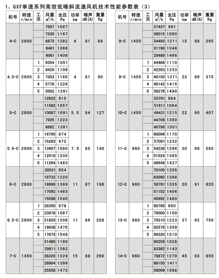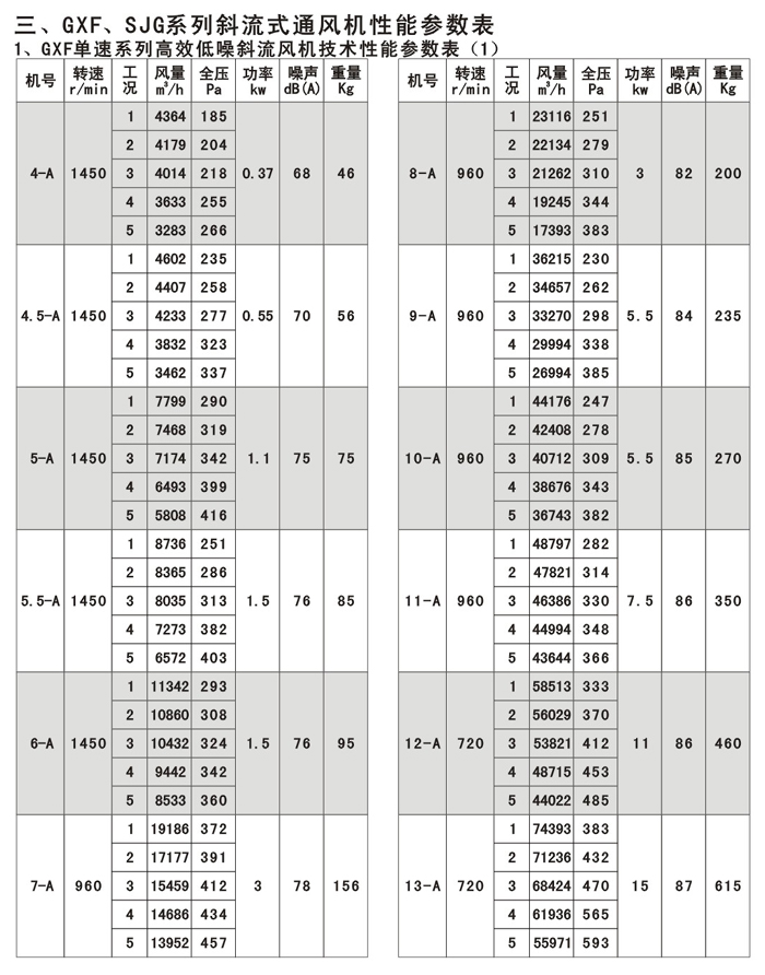 GXF系列斜流通風(fēng)機(jī)按葉輪直徑分為400-1400mm十四規(guī)格,按類型分為A、B、C、D、S五種類型,共五十八個(gè)機(jī)號(hào)。風(fēng)量由3000-90000m3/h,全壓由185-2500Pa;這樣就給設(shè)計(jì)部門和用戶單位提供了充分的選擇條件,具體數(shù)據(jù)請(qǐng)查風(fēng)機(jī)性能參數(shù)表。