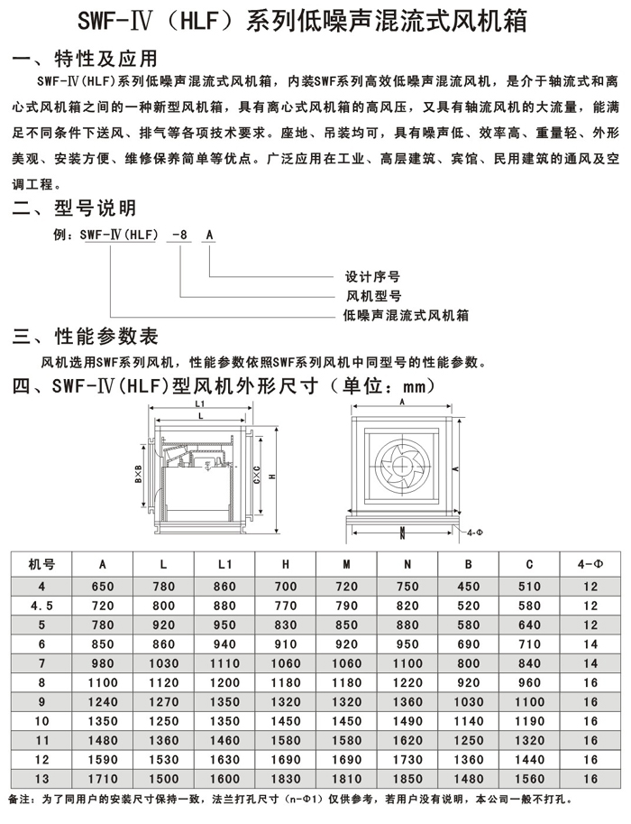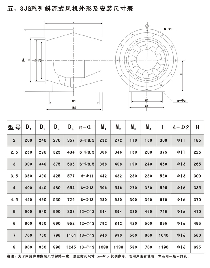 SJG系列斜流式通風(fēng)機(jī)按葉輪直徑分為200-800mm十幾種規(guī)格、十幾個(gè)機(jī)號(hào),風(fēng)量由200-2500m3/h,全壓由50-1200Pa;具體數(shù)據(jù)請(qǐng)查風(fēng)機(jī)性能參數(shù)表。 |